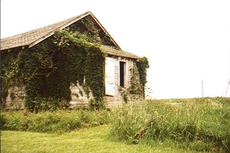 cemetery consisting of four tombstones in an overgrown grassy area next to an abandoned church, which was shrouded